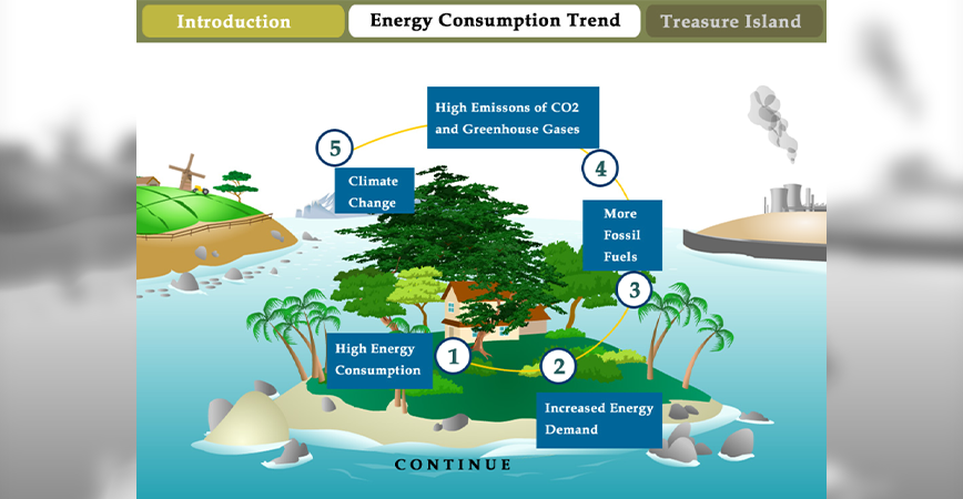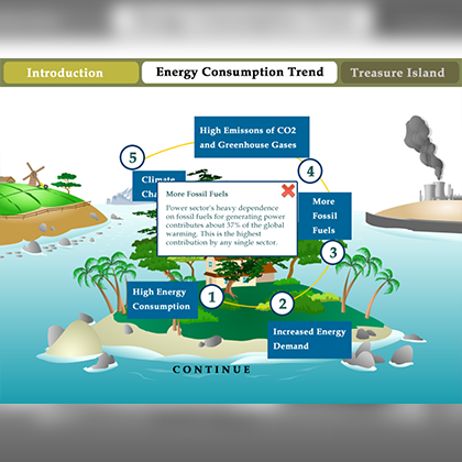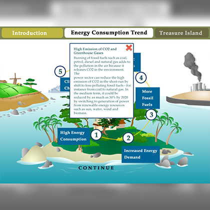 A gamified quiz, it allows the user to save the ecosystem of an island by taking the ‘right’ decisions. Through this game, we were trying to help the learners learn about energy conservation. In the game, the learners inherit an island and based on the choices they take, they are able to increase the value of their islands.
